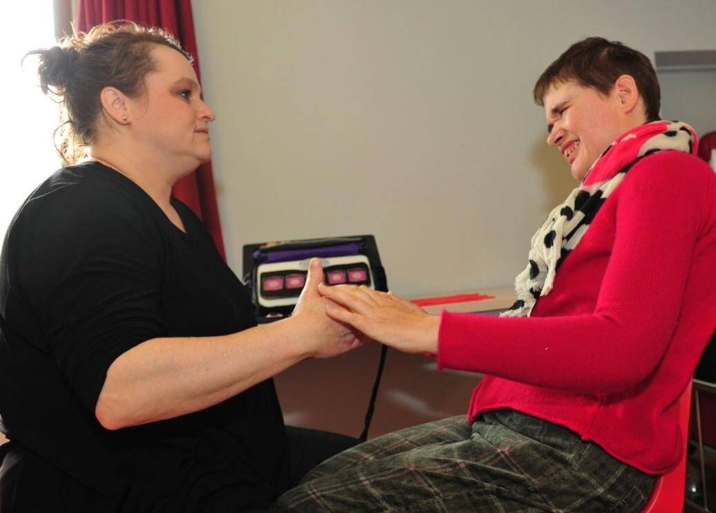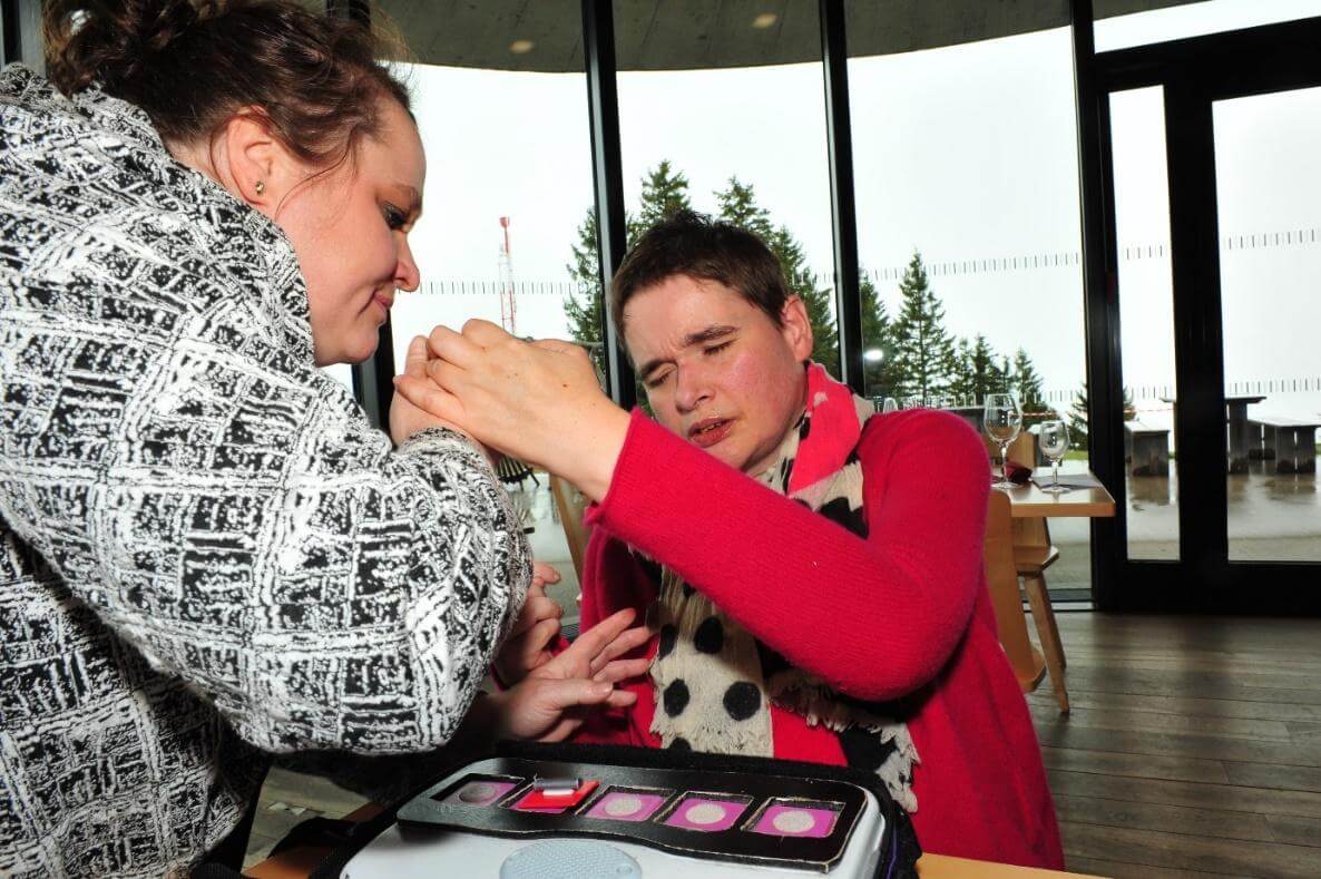 In de situatie OC inzetten, om de koppeling te herhalen. Op deze foto zit Aukje in de situatie, het gebaar (skilift) wordt herhaald, voor haar ligt de Proxtalker met voelsymbool en spraak.